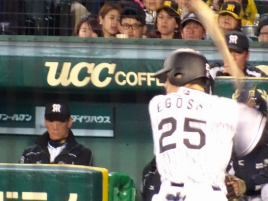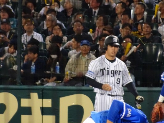 ワンアウト1塁3塁から江越選手の2塁打で、1点入りました。阪神ファンは大喜び