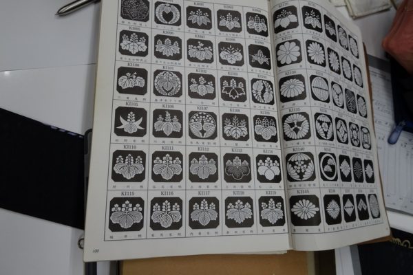 旭町を表す、紋も太閤桐で作るか 五七の桐で作るか!紋帳を見てみんなで相談しました。
