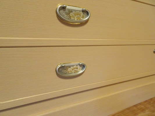引き出しの金具も前飾り金具とおそろいの金具で、牡丹をあしらっております。