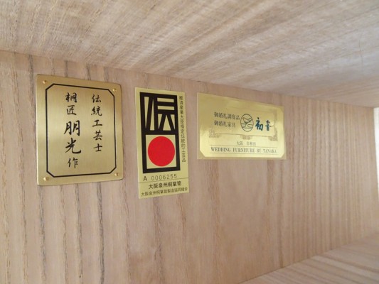 伝統工芸士 朋光(叙勲受賞者)の作品です。大阪泉州桐箪笥の伝統的工芸品の証紙が品質の証です。