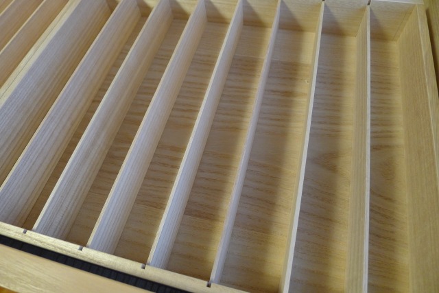 幅の広い大きな光沢のある引出しの底板は、初音の家具のこだわりです。