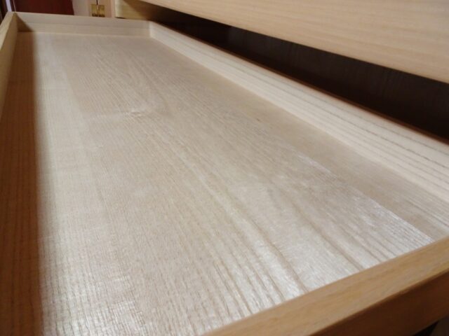引出しの細かなバランスのとれた桐の柾目の板は他ではご覧いただけないほど美しい杢目を使用させていただいています。