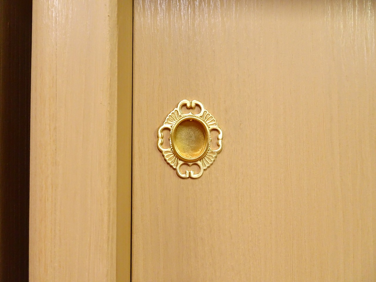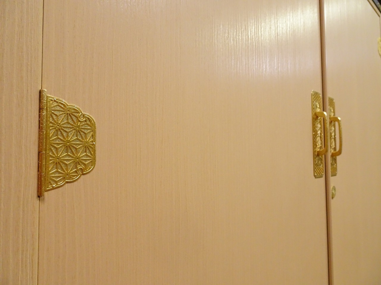 今回は金具のお色も金色でメッキ直しさせていただきました。飾り金具もとても凝った金具です。