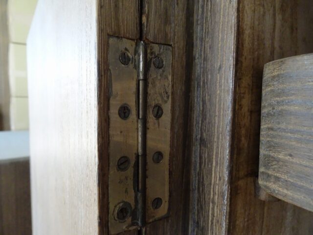 品質の良い桐箪笥はこのように本体と戸の部分を両方彫って金具(丁番)を取り付けています