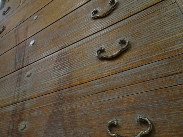 金具を慎重に外し屋外で洗いをし、屋外と屋内で乾燥させてから桐職人が傷んでいる箇所の部材の交換や割れの修復など桐箪笥の木地を丁寧に手直しした後、砥粉仕上げで仕上げました約3ケ月かけて蘇らせました。